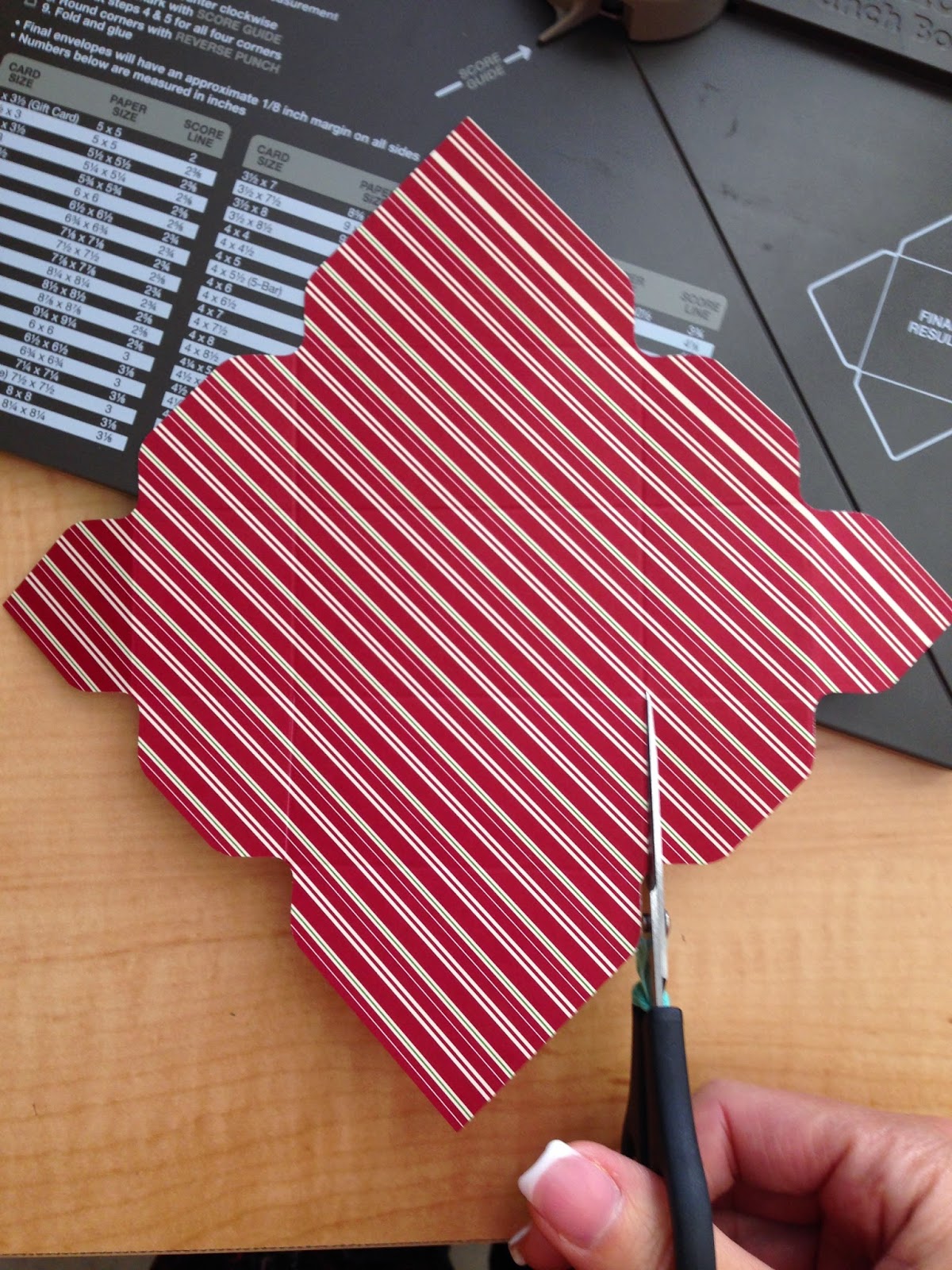 Next you will snip the paper on the score line to the right and to the left of the large triangle ends. Stop when the scissor tips reach the score line it crosses: